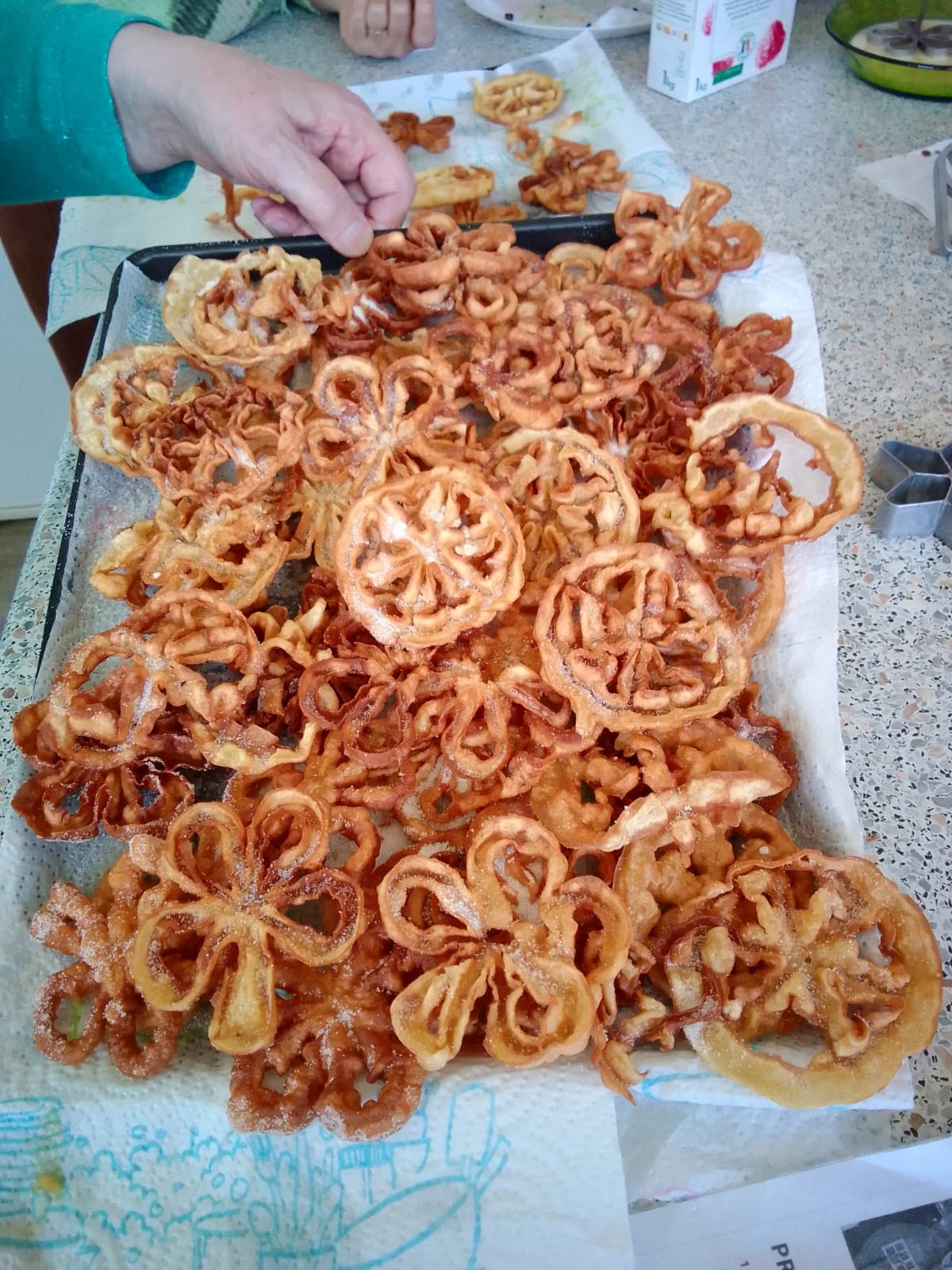 Nous ne sommes pas peu fières du résultat avant de prendre conscience qu’il ne nous reste plus que 5 kilos de boulettes à étaler, plier, étirer, amincir et mettre à sécher.